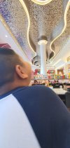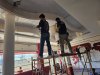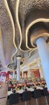 งานปิดผิวด้วยฟิล์มตกแต่งภายในสีทองแฮร์ไลน์ บริเวณฝ้าด้านในร้านอาหาร โครงสร้างเดิมเป็นไม้อัด เก็บเรียบด้วยโป๊วขาวเนื้ออะครีลิก ก่อนขัดให้เรียบด้วยกระดาษทรายจากนั้นจึงทยอยปิดผิวด้วยฟิล์มสีทองแฮร์ไลน์ ทีละชั้นทั้งด้านนอก และด้านใน ในรูปแบบตกแต่งดัดโค้ง