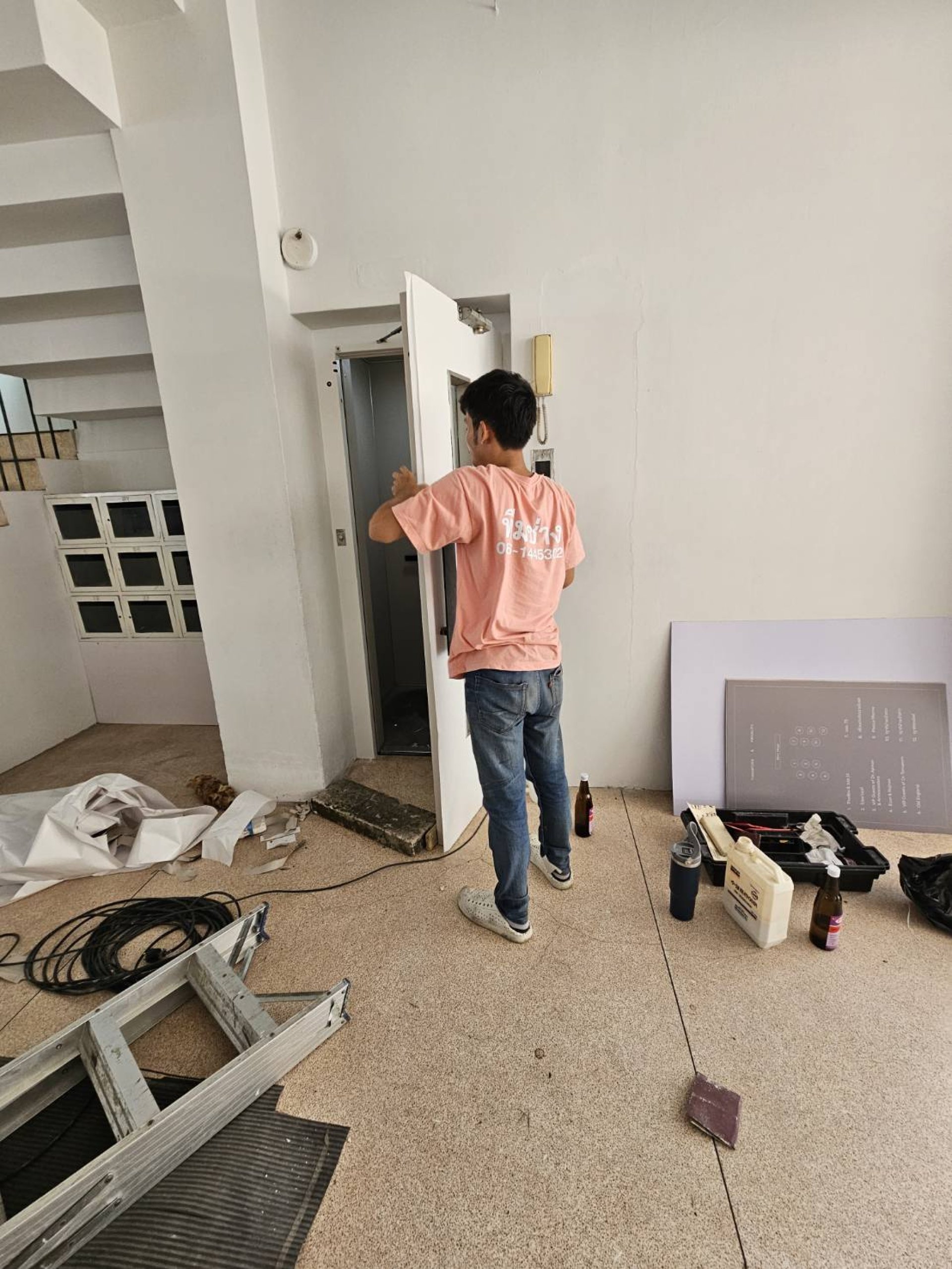 ปิดผิวเฟอร์นิเจอร์ บริเวณภายในและประตูลิฟต์โดยสารอาคารบ้านพักอาศัย ด้วยฟิล์มรหัส PS080 และ PS083 ลายไม้สีขาว และลายไม้สีครีม