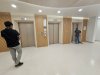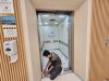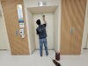 งานปิดผิวประตูหน้าลิฟต์โดยสาร ด้วยฟิล์มปิดผิวเฟอร์นิเจอร์ ลายโลหะสีเงินผิวเรียบ ปรับปรุงภาพลักษณ์ในอาคารสำนักงานให้เช่า