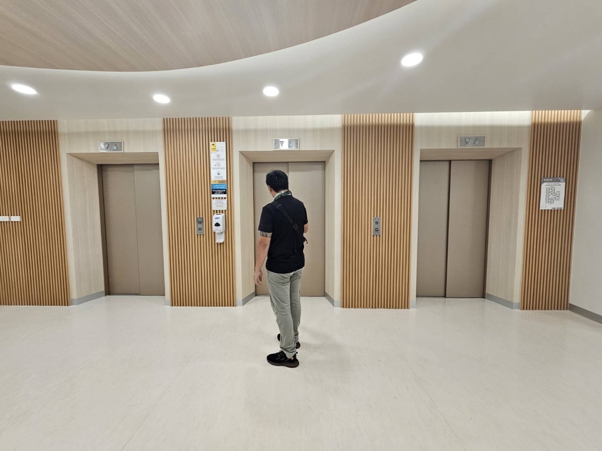 งานปิดผิวประตูหน้าลิฟต์โดยสาร ด้วยฟิล์มปิดผิวเฟอร์นิเจอร์ ลายโลหะสีเงินผิวเรียบ ปรับปรุงภาพลักษณ์ในอาคารสำนักงานให้เช่า