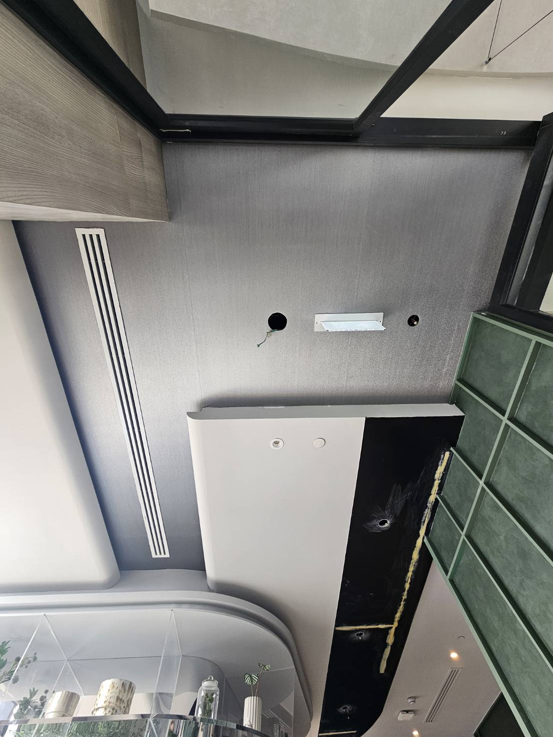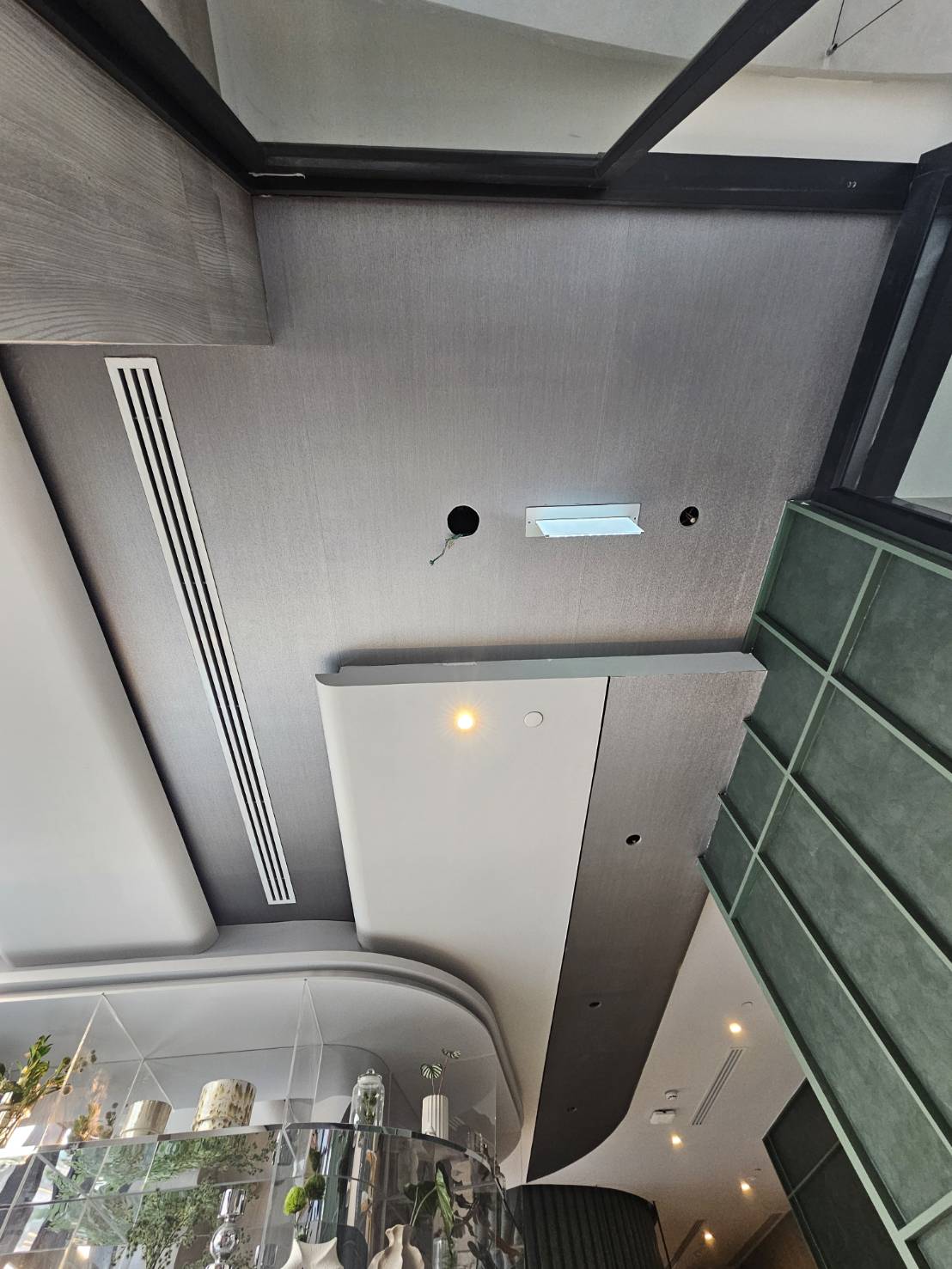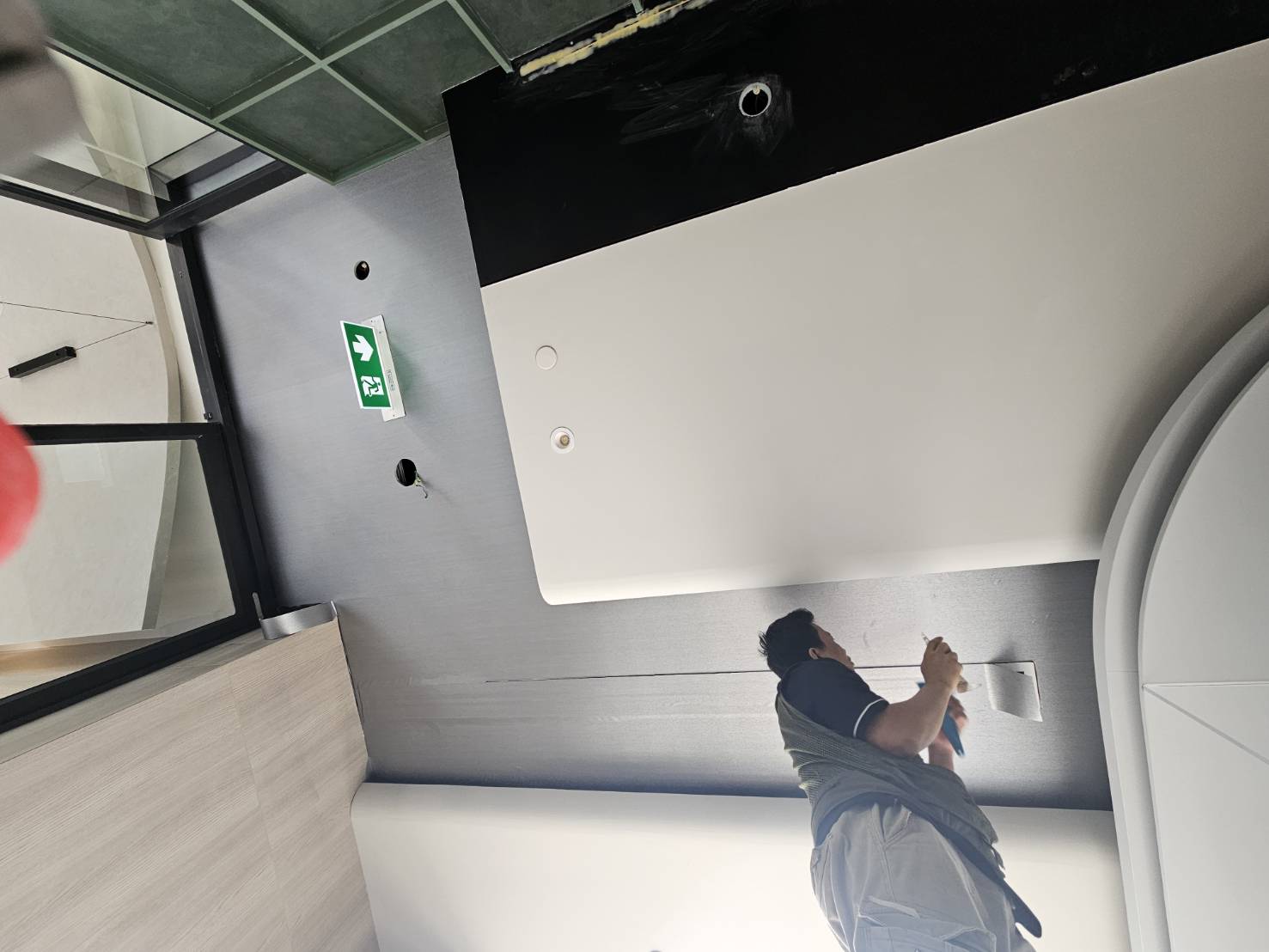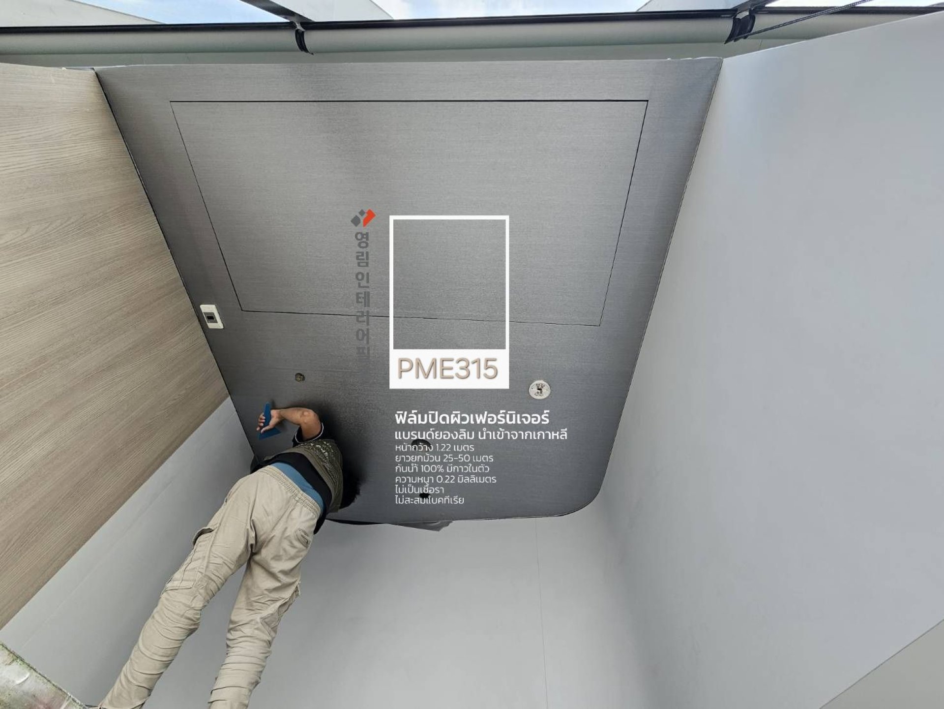 งานปิดผิวฝ้าเพดานโครงการคอนโด Nue Riverest Ratburana ริมแม่น้ำเจ้าพระยา กรุงเทพฯ ด้วยฟิล์มปิดผิวเฟอร์นิเจอร์แบรนด์ยองลิม รหัส PME315 ลายเมทัลลิกสีเทา Hirline