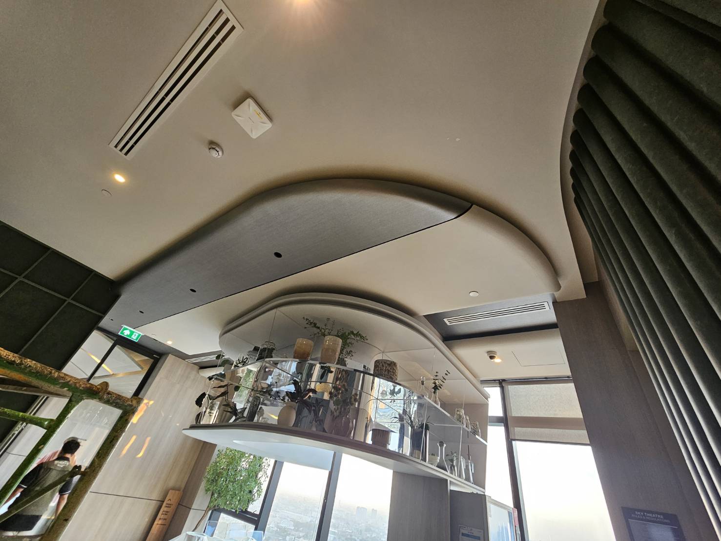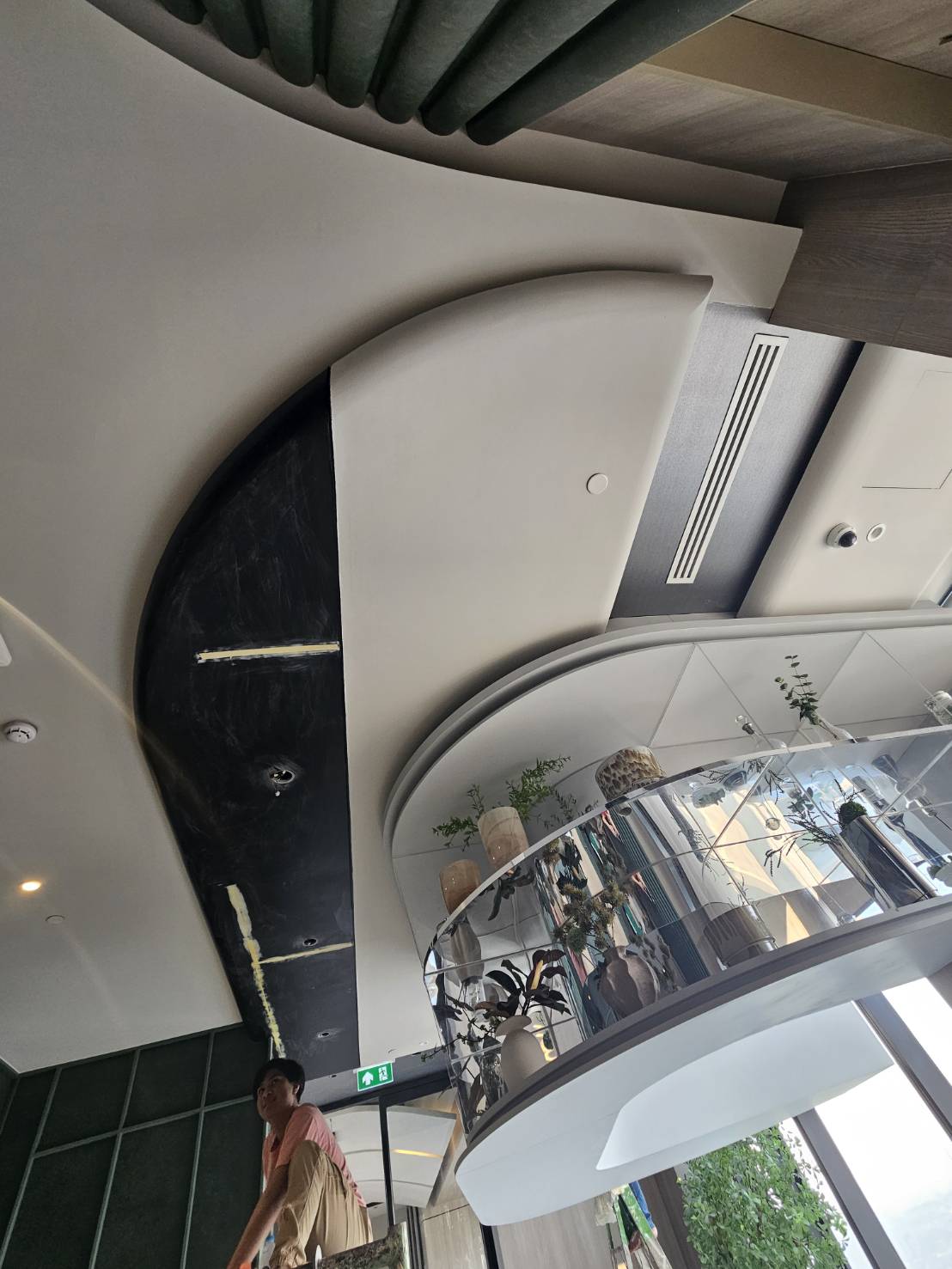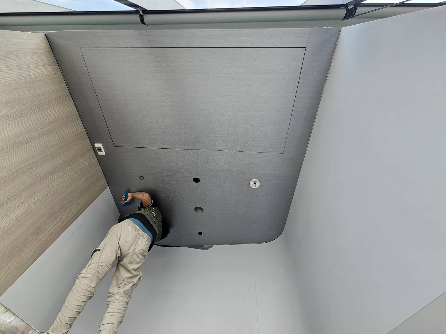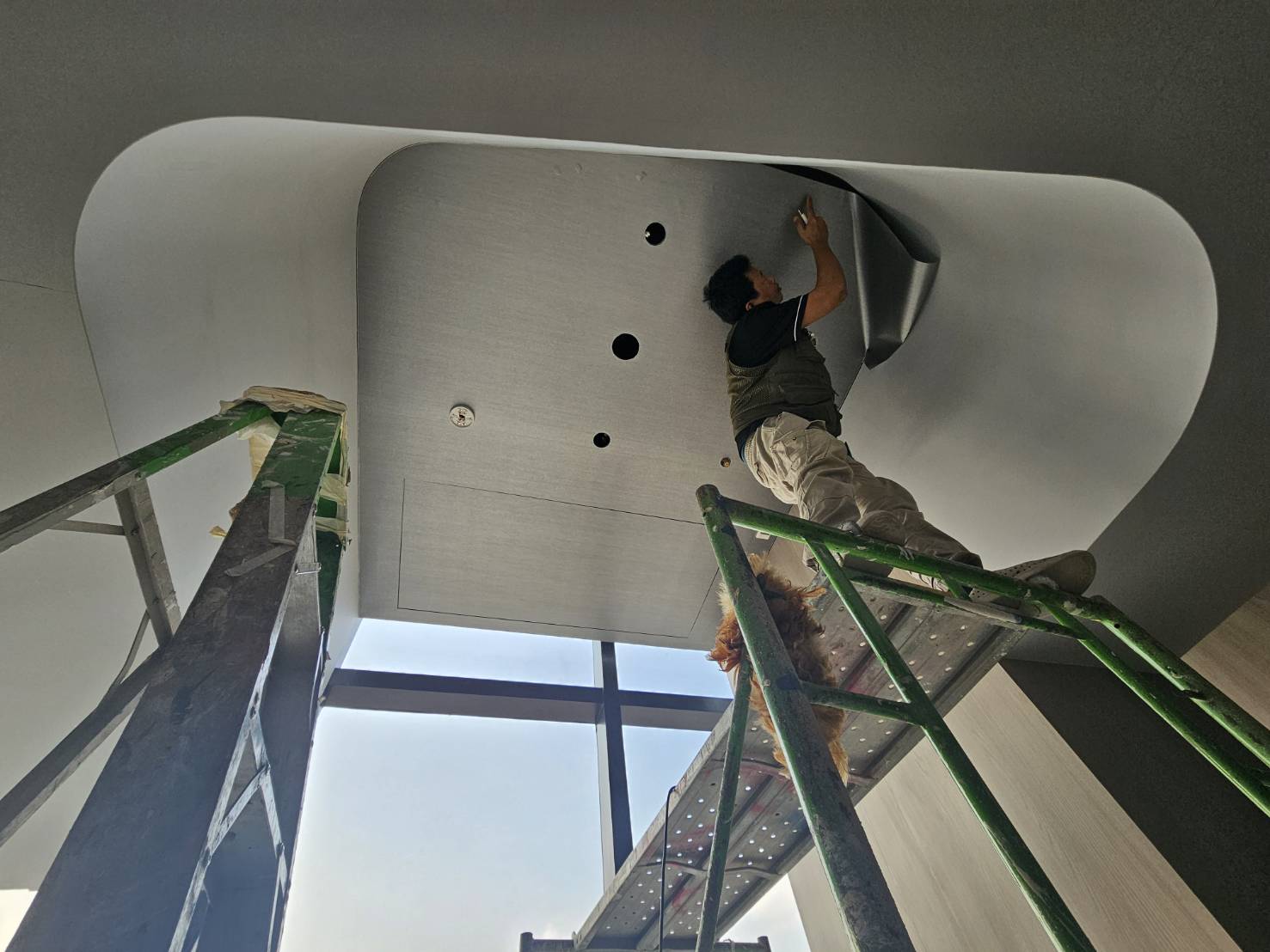 งานปิดผิวฝ้าเพดานโครงการคอนโด Nue Riverest Ratburana ริมแม่น้ำเจ้าพระยา กรุงเทพฯ ด้วยฟิล์มปิดผิวเฟอร์นิเจอร์แบรนด์ยองลิม รหัส PME315 ลายเมทัลลิกสีเทา Hirline